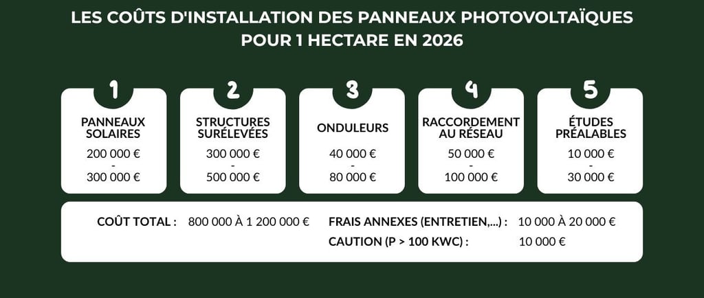 Les frais annexes, comme l'entretien annuel (1 à 2% du coût total, soit 10 000 à 20 000 €/ha), sont généralement pris en charge par l'opérateur. En outre, une caution de 10 000 € est requise pour les projets supérieurs à 100 kWc depuis mars 2025, visant à sécuriser les engagements.